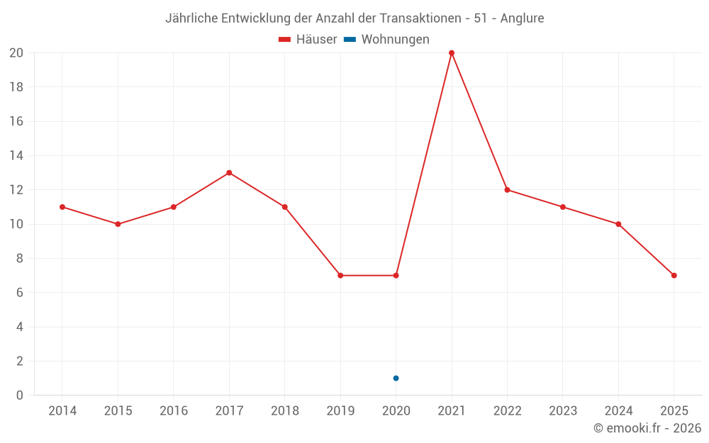 Der Durchschnittspreis auf den 20 Hausgeschäften der letzten 24 Monate in der Gemeinde Anglure betrug 1 364 € pro Quadratmeter für einen mittleren Immobilienwert von 109 000 €. Über diesen Zeitraum hinweg lagen 60% der Transaktionen zwischen 1 113 und 1 608 € pro Quadratmeter (vom 2. bis zum 8. Dezil).
