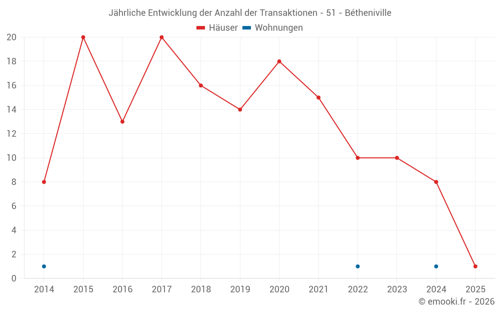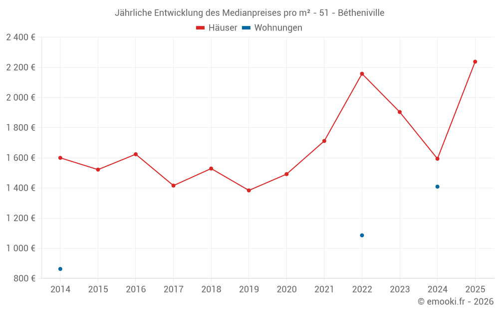 Der Durchschnittspreis auf den 17 Hausgeschäften der letzten 24 Monate in der Gemeinde Bétheniville betrug 1 887 € pro Quadratmeter für einen mittleren Immobilienwert von 176 700 €. Über diesen Zeitraum hinweg lagen 60% der Transaktionen zwischen 1 311 und 1 977 € pro Quadratmeter (vom 2. bis zum 8. Dezil).