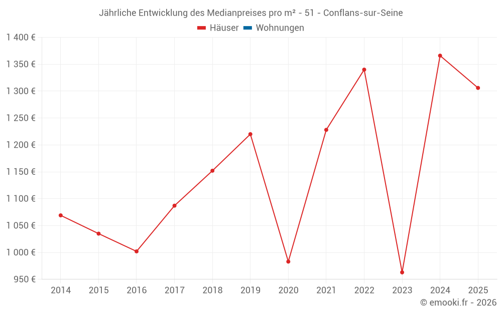 Der Durchschnittspreis auf den 17 Hausgeschäften der letzten 24 Monate in der Gemeinde Conflans-sur-Seine betrug 1 281 € pro Quadratmeter für einen mittleren Immobilienwert von 126 000 €. Über diesen Zeitraum hinweg lagen 60% der Transaktionen zwischen 947 und 1 437 € pro Quadratmeter (vom 2. bis zum 8. Dezil).
