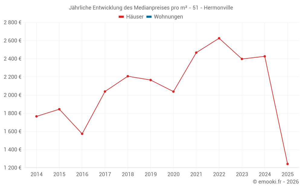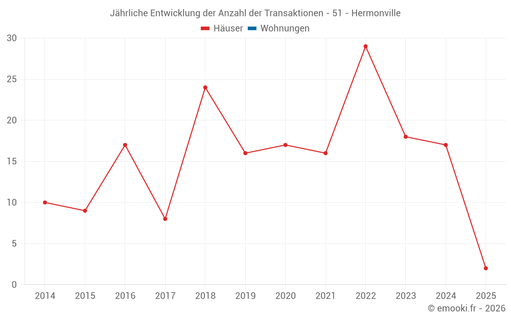 Der Durchschnittspreis auf den 30 Hausgeschäften der letzten 24 Monate in der Gemeinde Hermonville betrug 2 420 € pro Quadratmeter für einen mittleren Immobilienwert von 288 575 €. Über diesen Zeitraum hinweg lagen 60% der Transaktionen zwischen 1 988 und 3 024 € pro Quadratmeter (vom 2. bis zum 8. Dezil).