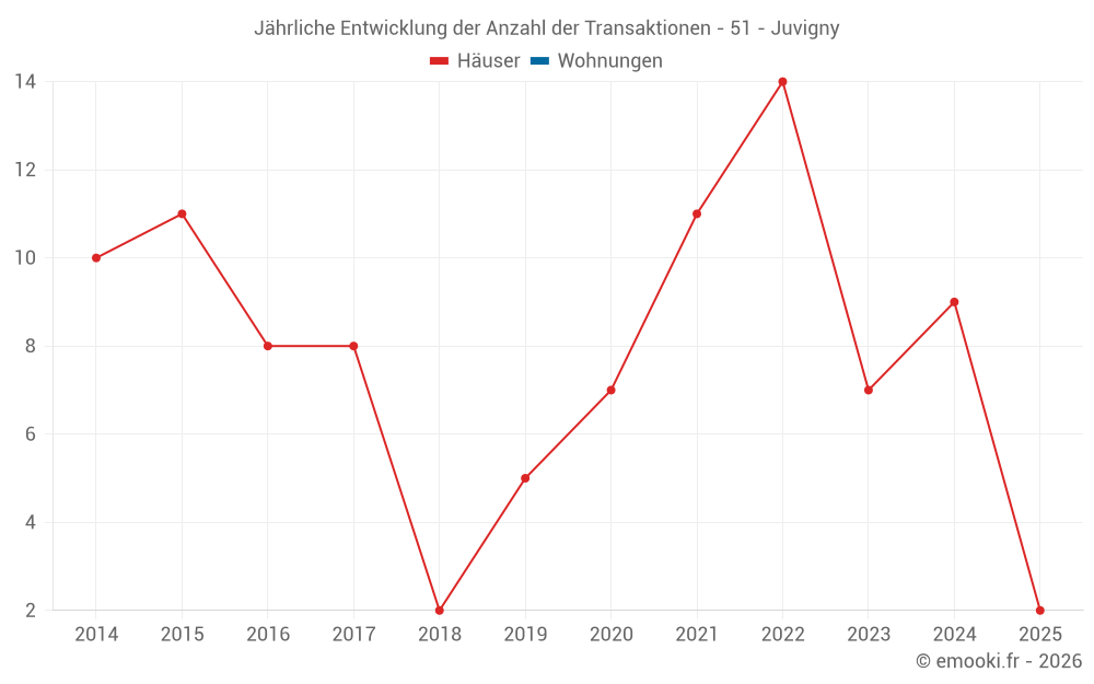 Der Durchschnittspreis auf den 16 Hausgeschäften der letzten 24 Monate in der Gemeinde Juvigny betrug 2 040 € pro Quadratmeter für einen mittleren Immobilienwert von 197 250 €. Über diesen Zeitraum hinweg lagen 60% der Transaktionen zwischen 1 485 und 2 335 € pro Quadratmeter (vom 2. bis zum 8. Dezil).