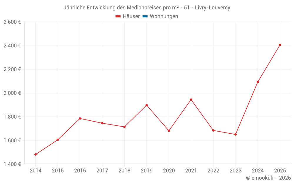 Der Durchschnittspreis auf den 21 Hausgeschäften der letzten 24 Monate in der Gemeinde Livry-Louvercy betrug 2 155 € pro Quadratmeter für einen mittleren Immobilienwert von 219 000 €. Über diesen Zeitraum hinweg lagen 60% der Transaktionen zwischen 1 757 und 2 385 € pro Quadratmeter (vom 2. bis zum 8. Dezil).