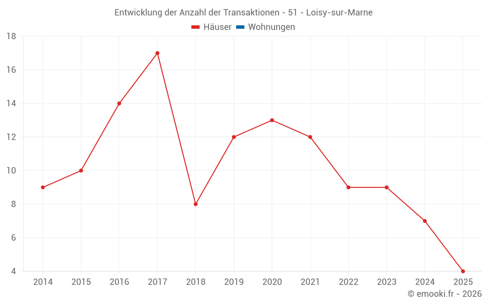 Der Durchschnittspreis auf den 15 Hausgeschäften der letzten 24 Monate in der Gemeinde Loisy-sur-Marne betrug 1 172 € pro Quadratmeter für einen mittleren Immobilienwert von 132 000 €. Über diesen Zeitraum hinweg lagen 60% der Transaktionen zwischen 919 und 1 672 € pro Quadratmeter (vom 2. bis zum 8. Dezil).