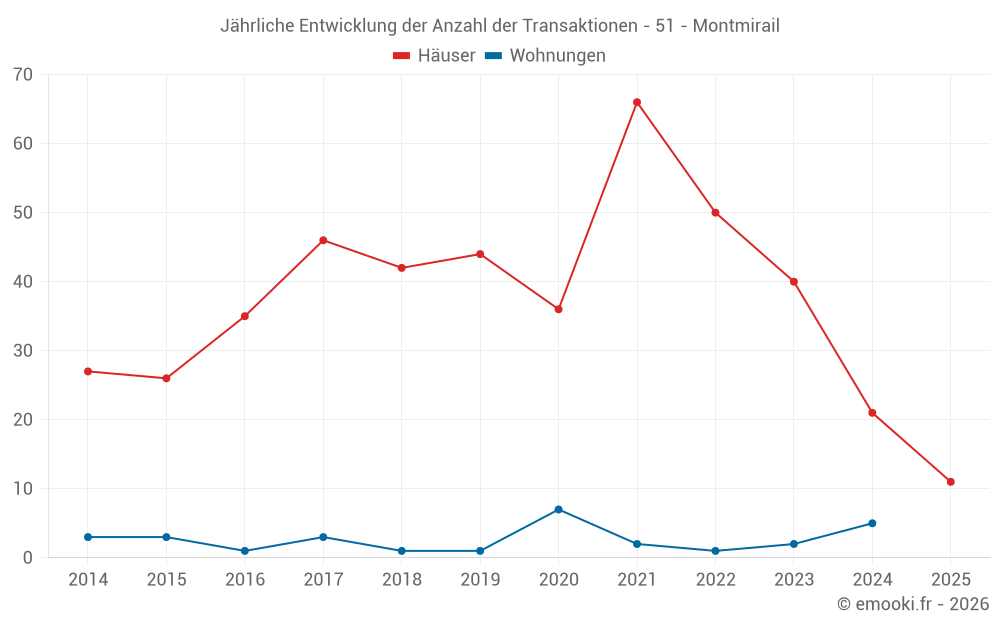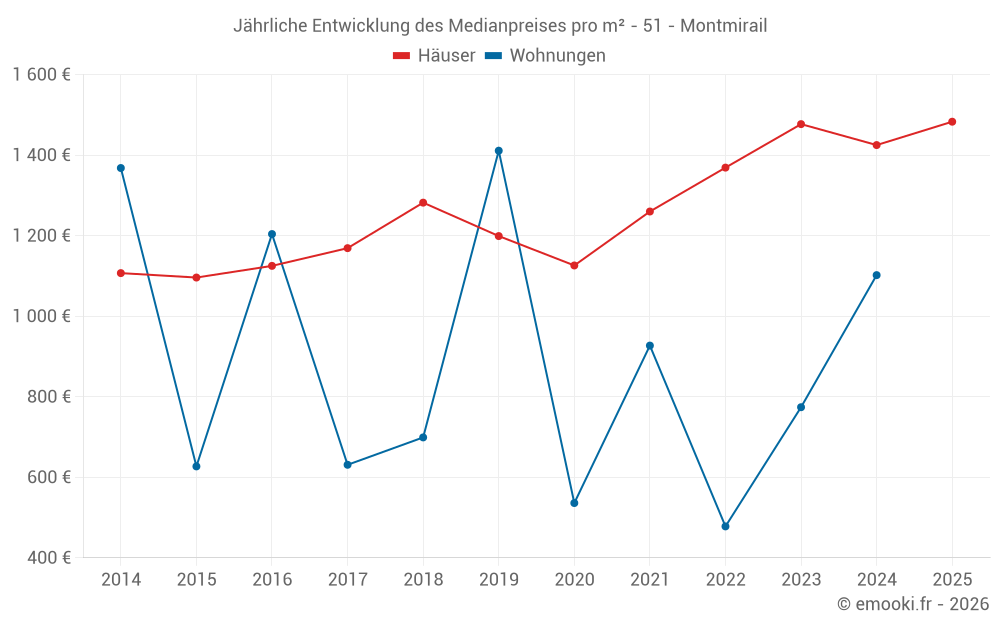Der Durchschnittspreis auf den 21 Hausgeschäften der letzten 12 Monate in der Gemeinde Montmirail betrug 1 402 € pro Quadratmeter für einen mittleren Immobilienwert von 145 000 €. Über diesen Zeitraum hinweg lagen 60% der Transaktionen zwischen 1 071 und 1 954 € pro Quadratmeter (vom 2. bis zum 8. Dezil).