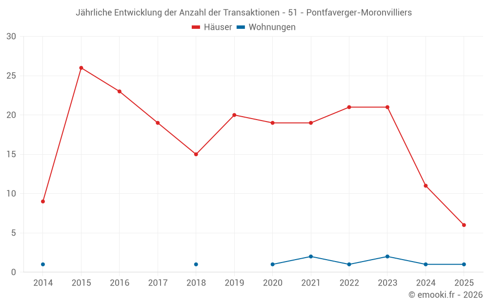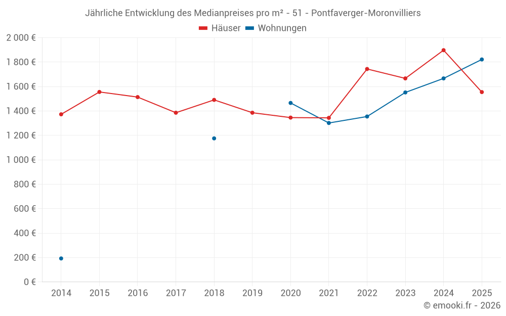 Der Durchschnittspreis auf den 27 Hausgeschäften der letzten 24 Monate in der Gemeinde Pontfaverger-Moronvilliers betrug 1 800 € pro Quadratmeter für einen mittleren Immobilienwert von 180 000 €. Über diesen Zeitraum hinweg lagen 60% der Transaktionen zwischen 1 452 und 2 208 € pro Quadratmeter (vom 2. bis zum 8. Dezil).