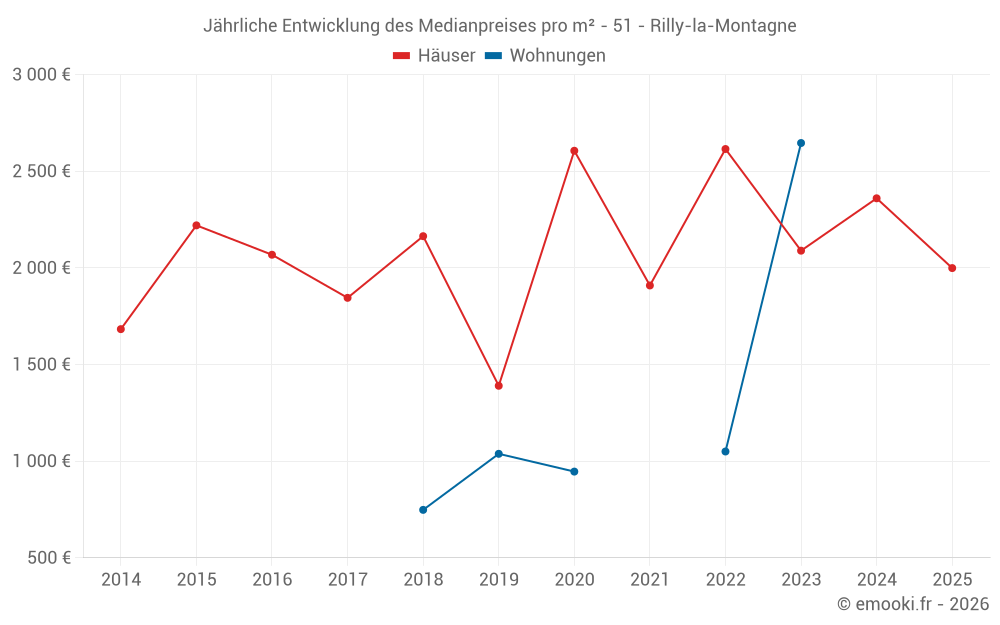 Der Durchschnittspreis auf den 24 Hausgeschäften der letzten 24 Monate in der Gemeinde Rilly-la-Montagne betrug 2 214 € pro Quadratmeter für einen mittleren Immobilienwert von 239 500 €. Über diesen Zeitraum hinweg lagen 60% der Transaktionen zwischen 1 608 und 3 035 € pro Quadratmeter (vom 2. bis zum 8. Dezil).