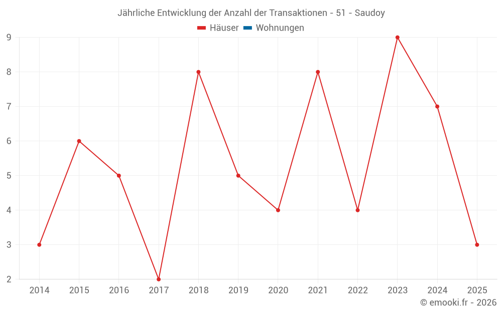 Der Durchschnittspreis auf den 16 Hausgeschäften der letzten 24 Monate in der Gemeinde Saudoy betrug 1 296 € pro Quadratmeter für einen mittleren Immobilienwert von 108 495 €. Über diesen Zeitraum hinweg lagen 60% der Transaktionen zwischen 818 und 1 722 € pro Quadratmeter (vom 2. bis zum 8. Dezil).