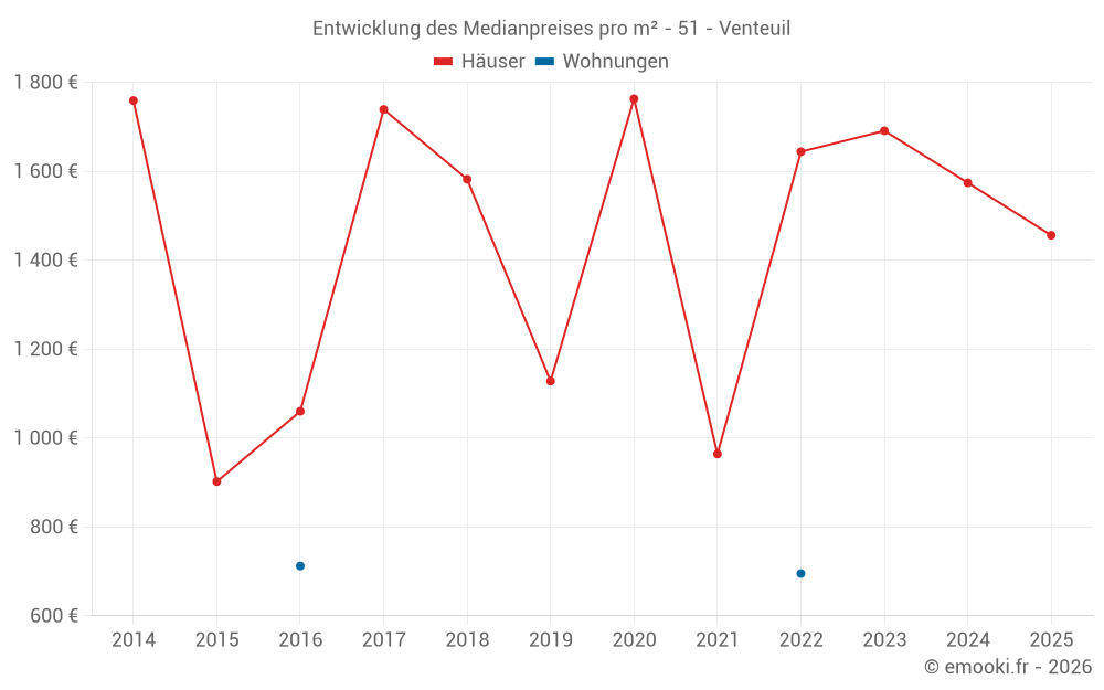 Der Durchschnittspreis auf den 14 Hausgeschäften der letzten 24 Monate in der Gemeinde Venteuil betrug 1 574 € pro Quadratmeter für einen mittleren Immobilienwert von 121 500 €. Über diesen Zeitraum hinweg lagen 60% der Transaktionen zwischen 852 und 2 138 € pro Quadratmeter (vom 2. bis zum 8. Dezil).