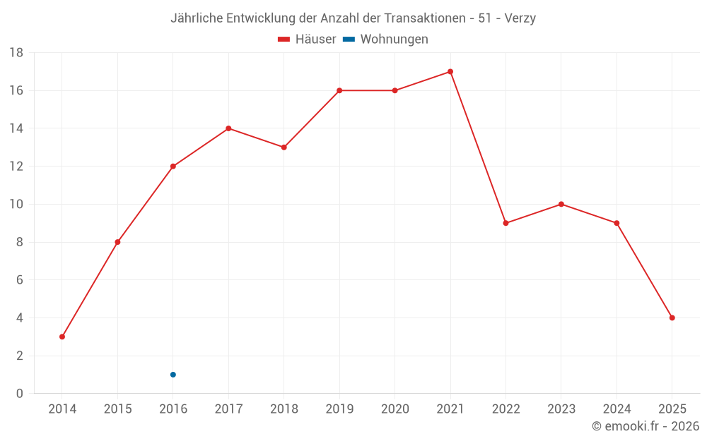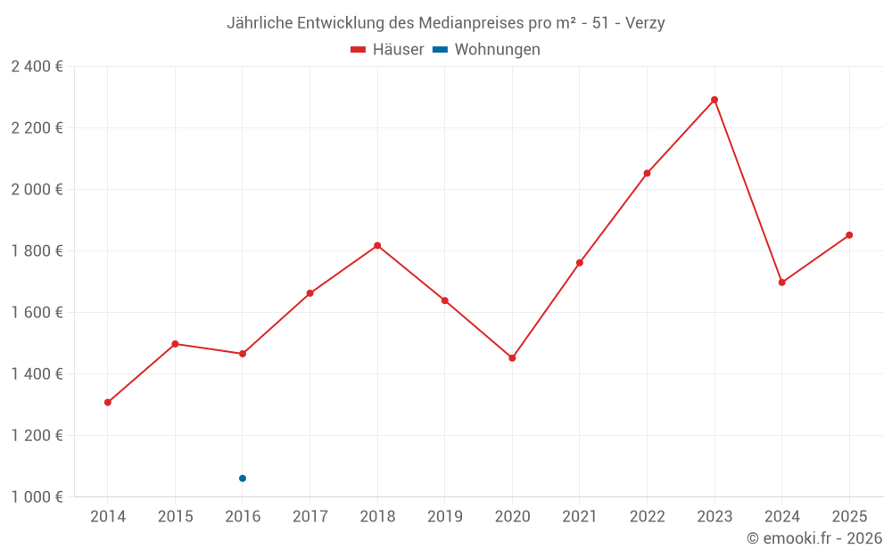 Der Durchschnittspreis auf den 16 Hausgeschäften der letzten 24 Monate in der Gemeinde Verzy betrug 1 904 € pro Quadratmeter für einen mittleren Immobilienwert von 206 925 €. Über diesen Zeitraum hinweg lagen 60% der Transaktionen zwischen 1 364 und 2 474 € pro Quadratmeter (vom 2. bis zum 8. Dezil).