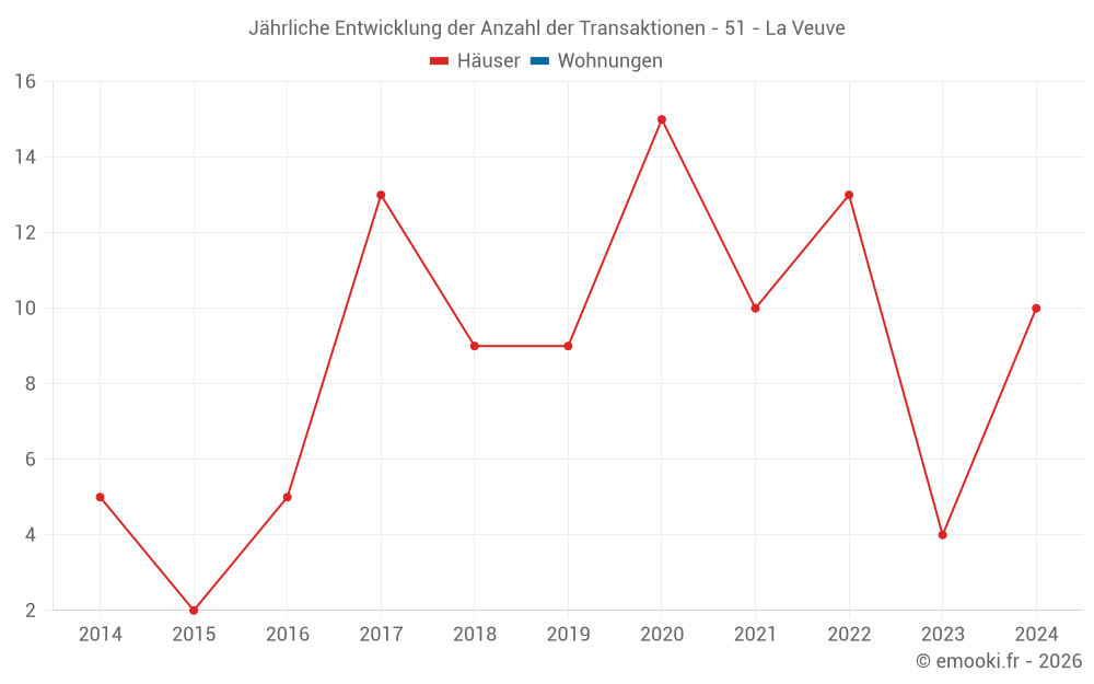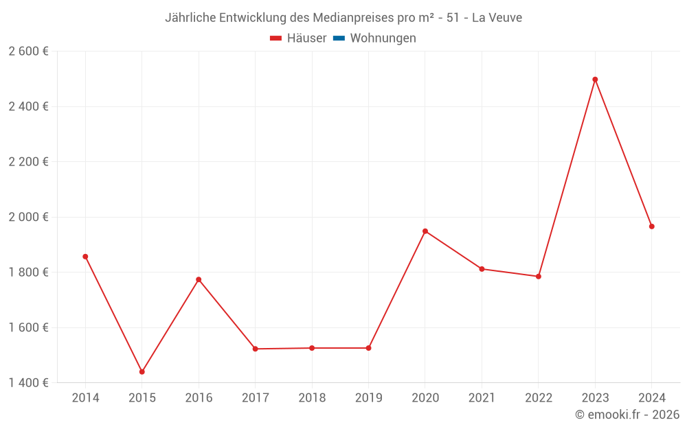 Der Durchschnittspreis auf den 14 Hausgeschäften der letzten 24 Monate in der Gemeinde La Veuve betrug 2 146 € pro Quadratmeter für einen mittleren Immobilienwert von 194 500 €. Über diesen Zeitraum hinweg lagen 60% der Transaktionen zwischen 1 535 und 2 618 € pro Quadratmeter (vom 2. bis zum 8. Dezil).