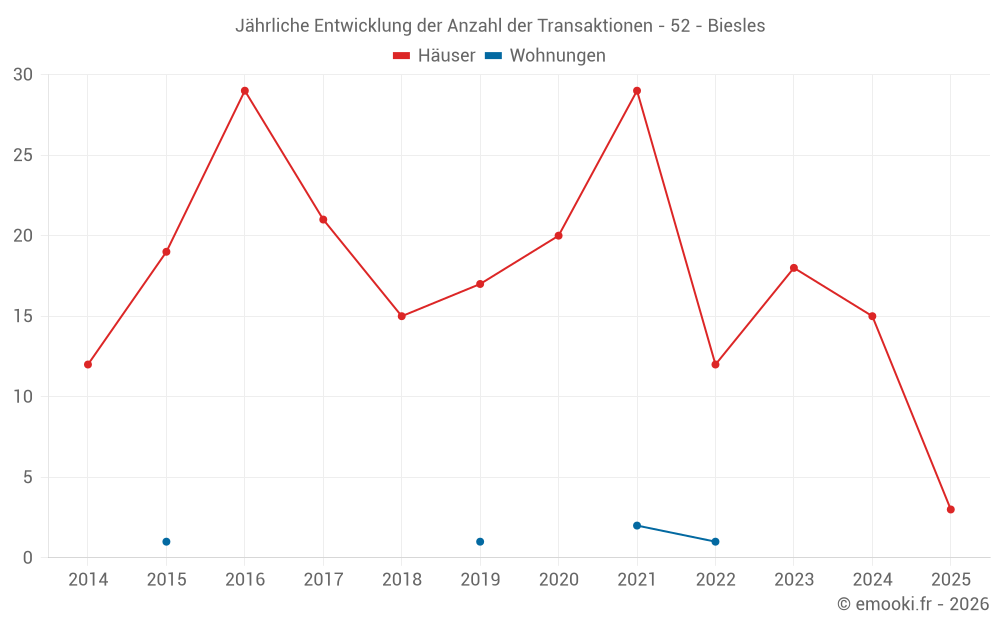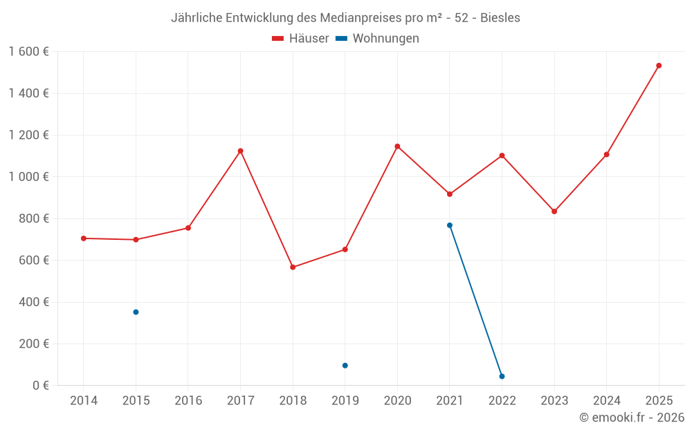 Der Durchschnittspreis auf den 27 Hausgeschäften der letzten 24 Monate in der Gemeinde Biesles betrug 1 118 € pro Quadratmeter für einen mittleren Immobilienwert von 95 000 €. Über diesen Zeitraum hinweg lagen 60% der Transaktionen zwischen 554 und 1 699 € pro Quadratmeter (vom 2. bis zum 8. Dezil).
