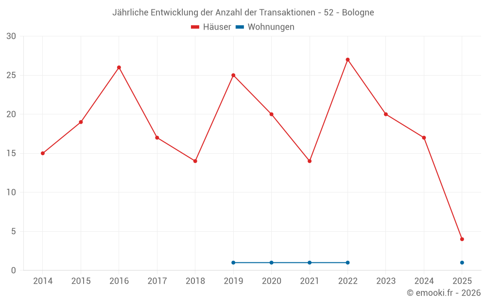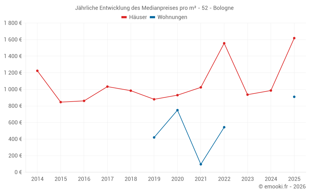 Der Durchschnittspreis auf den 29 Hausgeschäften der letzten 24 Monate in der Gemeinde Bologne betrug 928 € pro Quadratmeter für einen mittleren Immobilienwert von 90 000 €. Über diesen Zeitraum hinweg lagen 60% der Transaktionen zwischen 628 und 1 744 € pro Quadratmeter (vom 2. bis zum 8. Dezil).