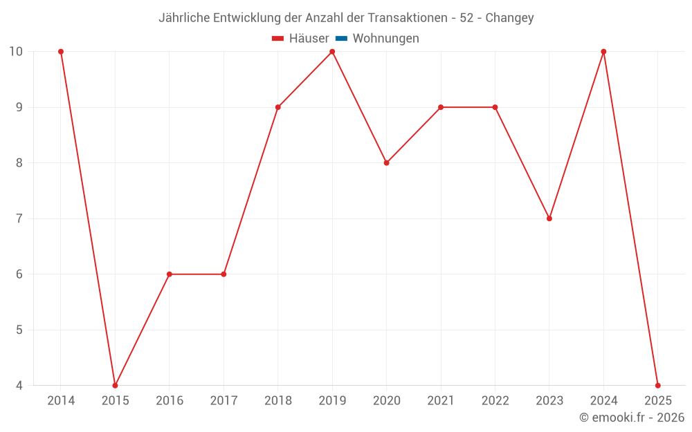 Der Durchschnittspreis auf den 17 Hausgeschäften der letzten 24 Monate in der Gemeinde Changey betrug 1 638 € pro Quadratmeter für einen mittleren Immobilienwert von 105 000 €. Über diesen Zeitraum hinweg lagen 60% der Transaktionen zwischen 1 151 und 2 159 € pro Quadratmeter (vom 2. bis zum 8. Dezil).