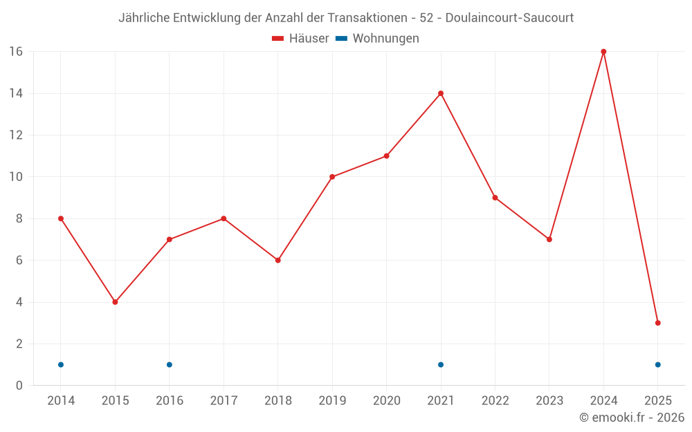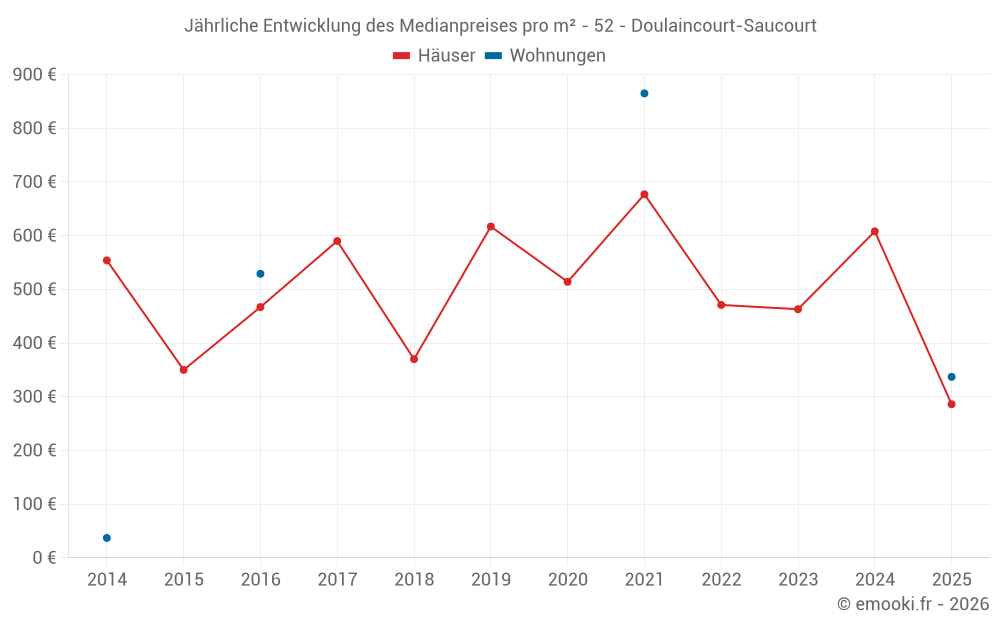 Der Durchschnittspreis auf den 22 Hausgeschäften der letzten 24 Monate in der Gemeinde Doulaincourt-Saucourt betrug 544 € pro Quadratmeter für einen mittleren Immobilienwert von 40 500 €. Über diesen Zeitraum hinweg lagen 60% der Transaktionen zwischen 277 und 962 € pro Quadratmeter (vom 2. bis zum 8. Dezil).