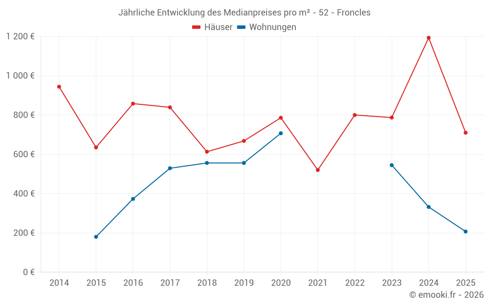 Der Durchschnittspreis auf den 25 Hausgeschäften der letzten 24 Monate in der Gemeinde Froncles betrug 833 € pro Quadratmeter für einen mittleren Immobilienwert von 78 000 €. Über diesen Zeitraum hinweg lagen 60% der Transaktionen zwischen 635 und 1 204 € pro Quadratmeter (vom 2. bis zum 8. Dezil).