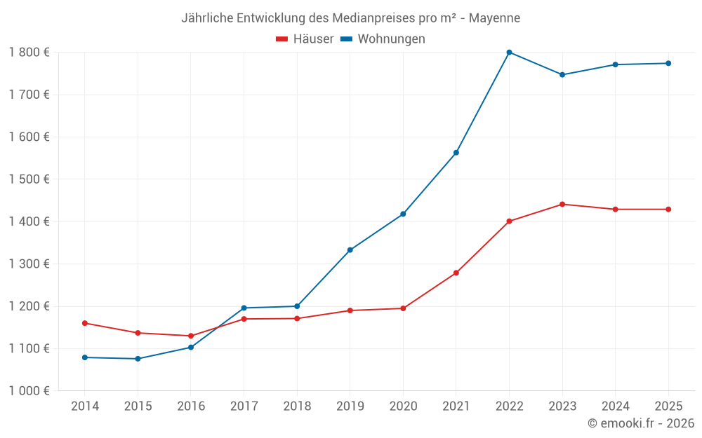 Der Durchschnittspreis auf den 232 Wohnungstransaktionen der letzten 6 Monate im Mayenne-Departement betrug 1 774 € pro Quadratmeter für einen mittleren Immobilienwert von 110 000 €. Über diesen Zeitraum hinweg lagen 60% der Transaktionen zwischen 1 247 und 2 362 € pro Quadratmeter (vom 2. bis zum 8. Dezil).