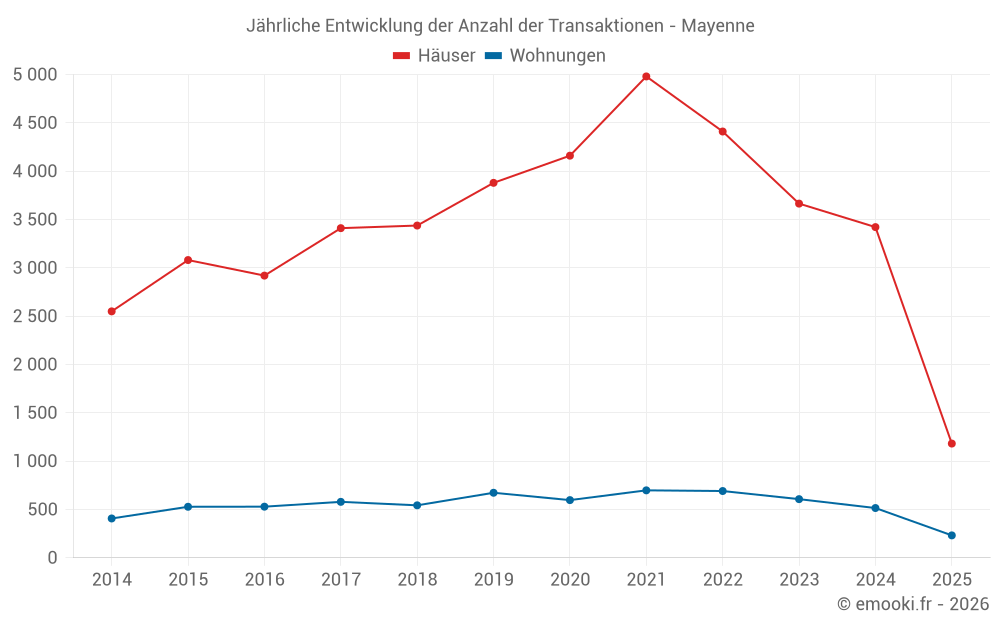 Der Durchschnittspreis auf den 327 Hausgeschäften der letzten 3 Monate im Mayenne-Departement betrug 1 420 € pro Quadratmeter für einen mittleren Immobilienwert von 135 000 €. Über diesen Zeitraum hinweg lagen 60% der Transaktionen zwischen 736 und 2 107 € pro Quadratmeter (vom 2. bis zum 8. Dezil).