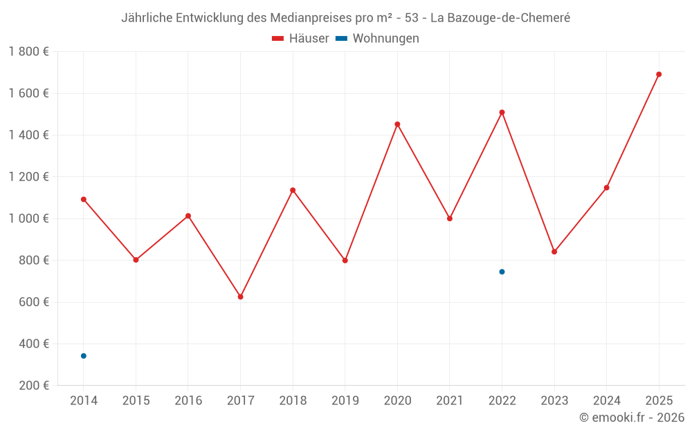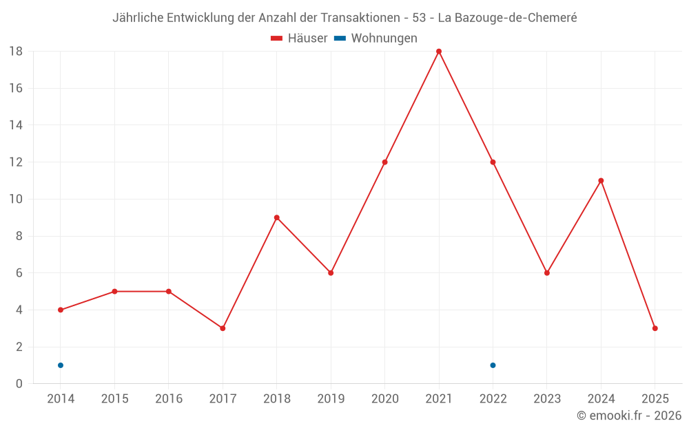 Der Durchschnittspreis auf den 18 Hausgeschäften der letzten 24 Monate in der Gemeinde La Bazouge-de-Chemeré betrug 1 160 € pro Quadratmeter für einen mittleren Immobilienwert von 121 500 €. Über diesen Zeitraum hinweg lagen 60% der Transaktionen zwischen 569 und 1 569 € pro Quadratmeter (vom 2. bis zum 8. Dezil).
