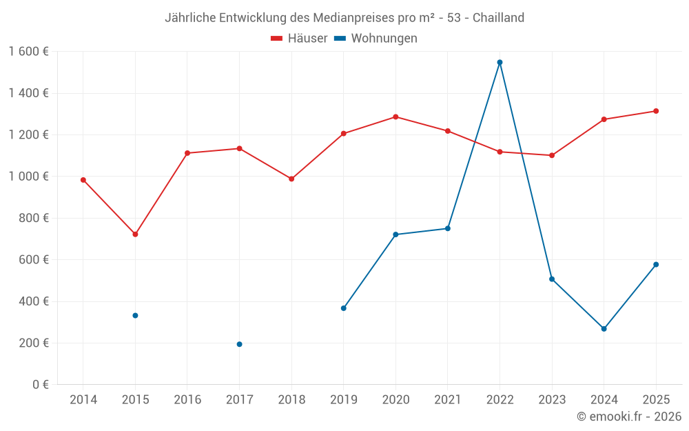 Der Durchschnittspreis auf den 26 Hausgeschäften der letzten 24 Monate in der Gemeinde Chailland betrug 1 176 € pro Quadratmeter für einen mittleren Immobilienwert von 105 000 €. Über diesen Zeitraum hinweg lagen 60% der Transaktionen zwischen 846 und 1 408 € pro Quadratmeter (vom 2. bis zum 8. Dezil).