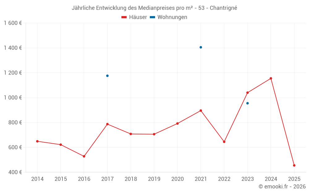 Der Durchschnittspreis auf den 21 Hausgeschäften der letzten 24 Monate in der Gemeinde Chantrigné betrug 1 019 € pro Quadratmeter für einen mittleren Immobilienwert von 87 000 €. Über diesen Zeitraum hinweg lagen 60% der Transaktionen zwischen 489 und 1 404 € pro Quadratmeter (vom 2. bis zum 8. Dezil).