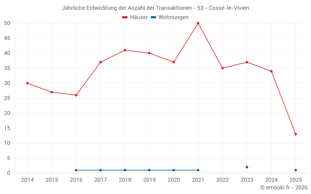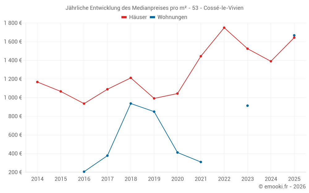 Der Durchschnittspreis auf den 33 Hausgeschäften der letzten 12 Monate in der Gemeinde Cossé-le-Vivien betrug 1 496 € pro Quadratmeter für einen mittleren Immobilienwert von 146 000 €. Über diesen Zeitraum hinweg lagen 60% der Transaktionen zwischen 1 019 und 1 914 € pro Quadratmeter (vom 2. bis zum 8. Dezil).