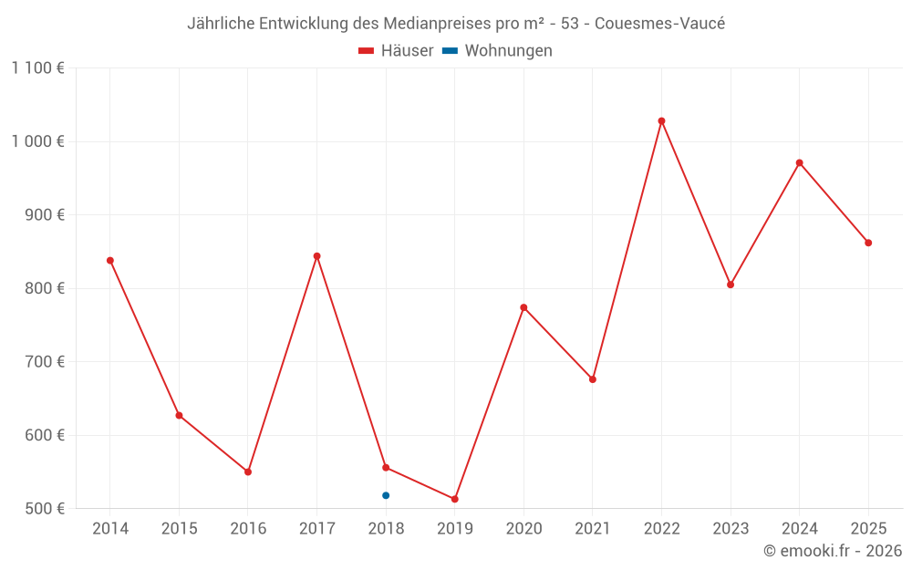 Der Durchschnittspreis auf den 19 Hausgeschäften der letzten 24 Monate in der Gemeinde Couesmes-Vaucé betrug 971 € pro Quadratmeter für einen mittleren Immobilienwert von 73 000 €. Über diesen Zeitraum hinweg lagen 60% der Transaktionen zwischen 575 und 1 127 € pro Quadratmeter (vom 2. bis zum 8. Dezil).