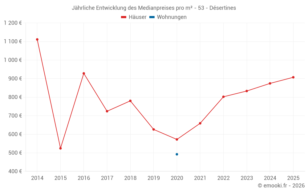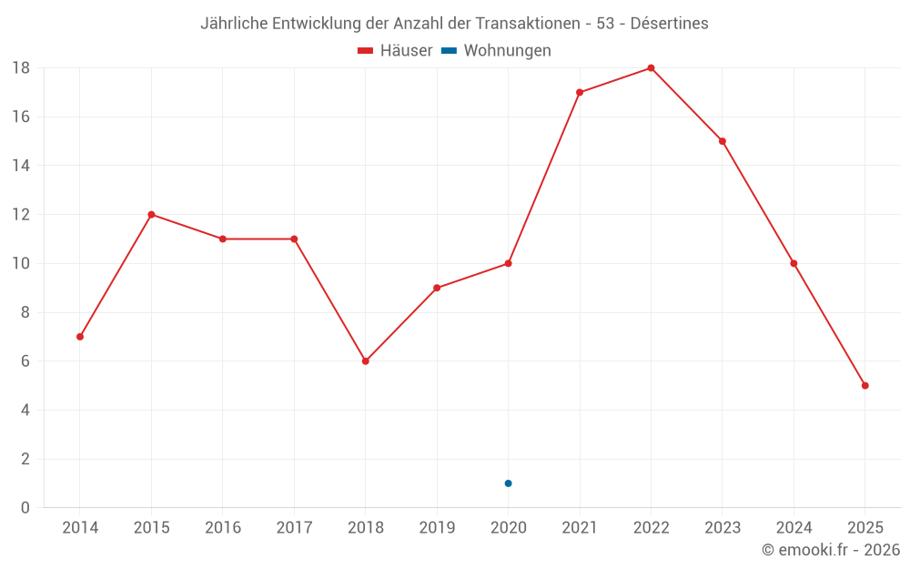 Der Durchschnittspreis auf den 24 Hausgeschäften der letzten 24 Monate in der Gemeinde Désertines betrug 878 € pro Quadratmeter für einen mittleren Immobilienwert von 83 500 €. Über diesen Zeitraum hinweg lagen 60% der Transaktionen zwischen 667 und 1 381 € pro Quadratmeter (vom 2. bis zum 8. Dezil).