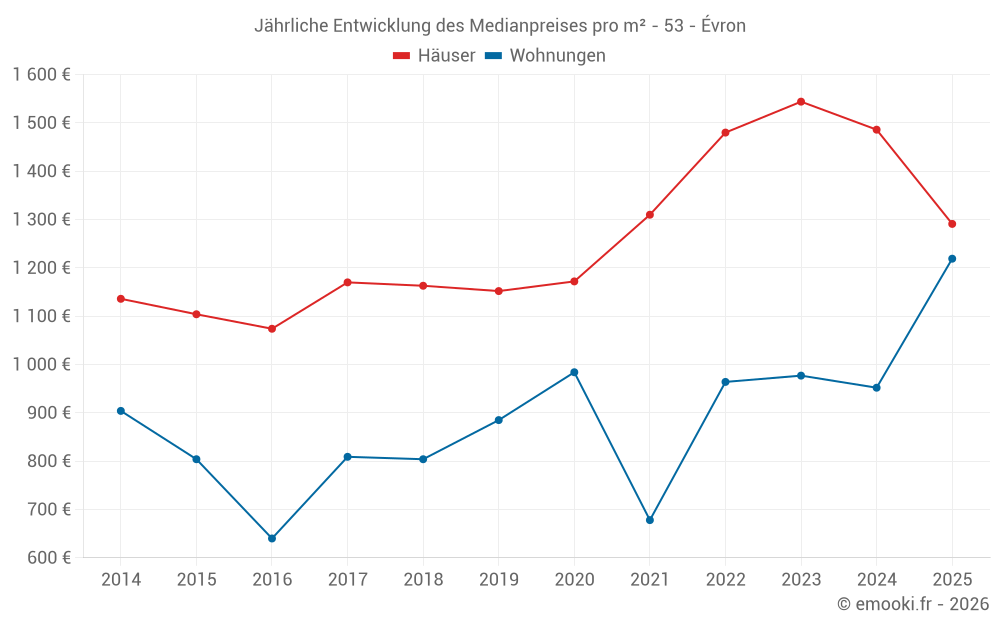 Der Durchschnittspreis auf den 14 Wohnungstransaktionen der letzten 24 Monate in der Gemeinde Évron betrug 1 008 € pro Quadratmeter für einen mittleren Immobilienwert von 62 443 €. Über diesen Zeitraum hinweg lagen 60% der Transaktionen zwischen 755 und 1 597 € pro Quadratmeter (vom 2. bis zum 8. Dezil).