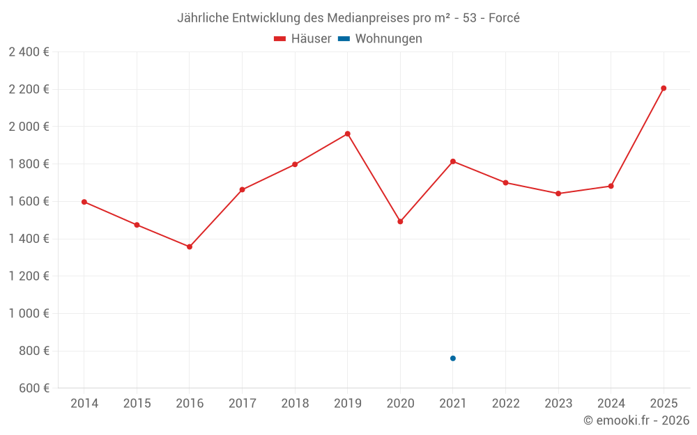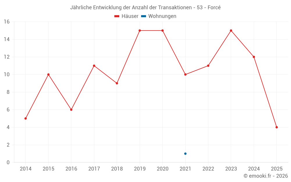Der Durchschnittspreis auf den 22 Hausgeschäften der letzten 24 Monate in der Gemeinde Forcé betrug 1 654 € pro Quadratmeter für einen mittleren Immobilienwert von 177 195 €. Über diesen Zeitraum hinweg lagen 60% der Transaktionen zwischen 1 097 und 2 077 € pro Quadratmeter (vom 2. bis zum 8. Dezil).