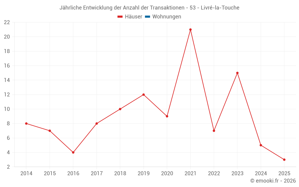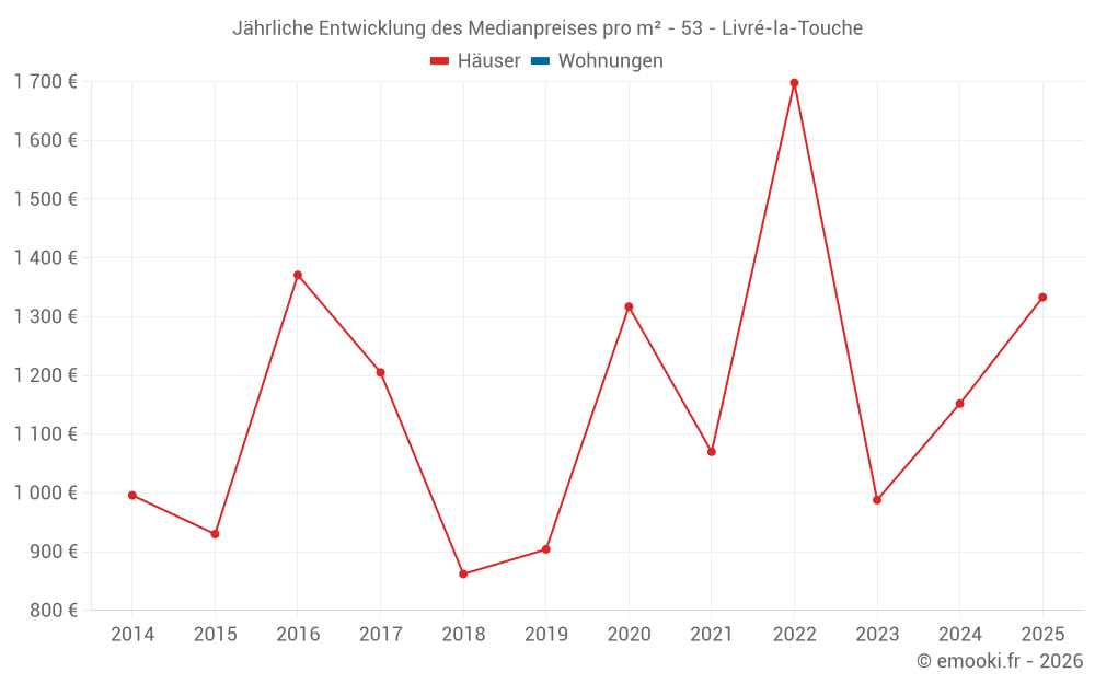 Der Durchschnittspreis auf den 18 Hausgeschäften der letzten 24 Monate in der Gemeinde Livré-la-Touche betrug 1 216 € pro Quadratmeter für einen mittleren Immobilienwert von 134 867 €. Über diesen Zeitraum hinweg lagen 60% der Transaktionen zwischen 927 und 1 440 € pro Quadratmeter (vom 2. bis zum 8. Dezil).