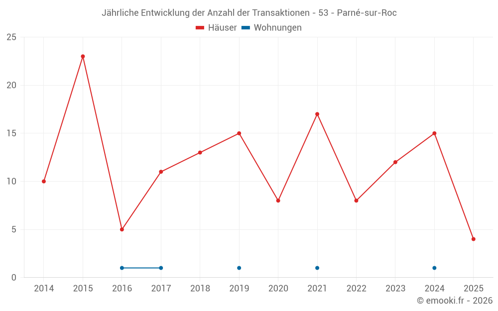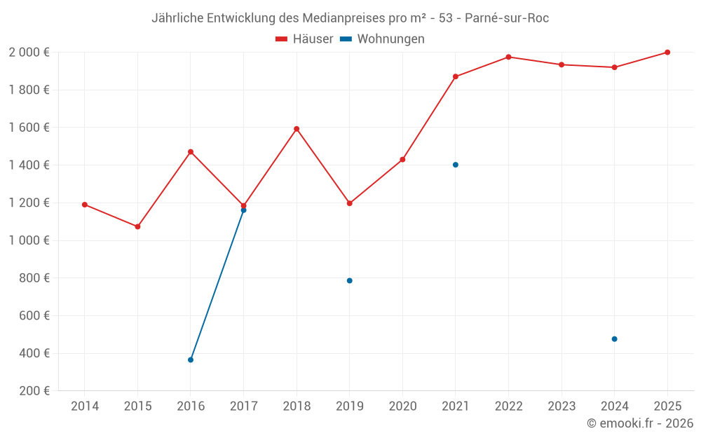 Der Durchschnittspreis auf den 27 Hausgeschäften der letzten 24 Monate in der Gemeinde Parné-sur-Roc betrug 1 920 € pro Quadratmeter für einen mittleren Immobilienwert von 180 000 €. Über diesen Zeitraum hinweg lagen 60% der Transaktionen zwischen 1 490 und 2 180 € pro Quadratmeter (vom 2. bis zum 8. Dezil).
