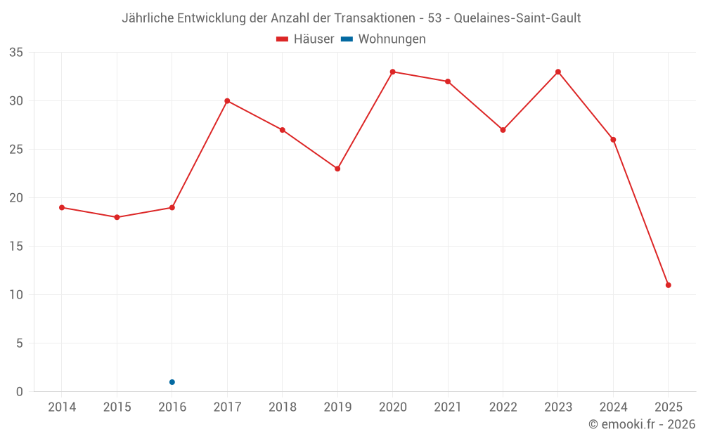 Der Durchschnittspreis auf den 27 Hausgeschäften der letzten 12 Monate in der Gemeinde Quelaines-Saint-Gault betrug 1 442 € pro Quadratmeter für einen mittleren Immobilienwert von 135 000 €. Über diesen Zeitraum hinweg lagen 60% der Transaktionen zwischen 902 und 1 790 € pro Quadratmeter (vom 2. bis zum 8. Dezil).