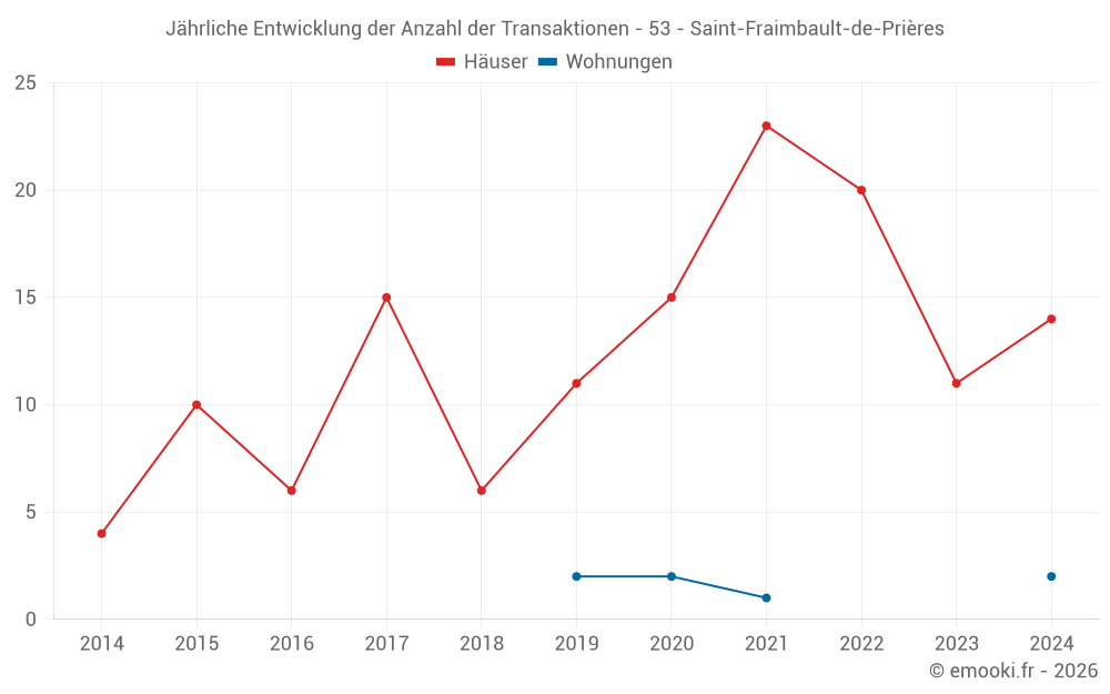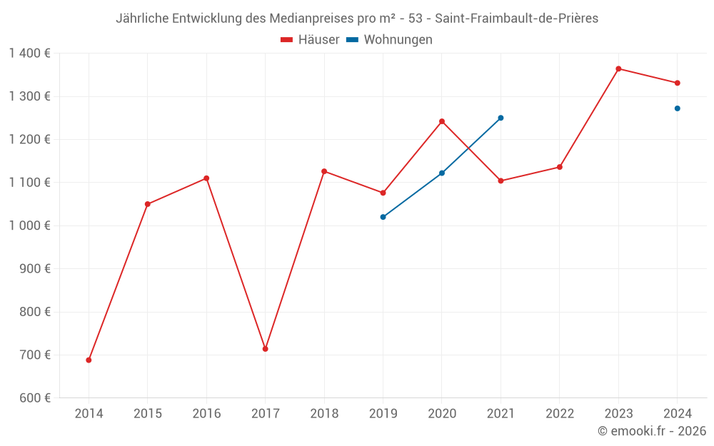 Der Durchschnittspreis auf den 21 Hausgeschäften der letzten 24 Monate in der Gemeinde Saint-Fraimbault-de-Prières betrug 1 293 € pro Quadratmeter für einen mittleren Immobilienwert von 99 500 €. Über diesen Zeitraum hinweg lagen 60% der Transaktionen zwischen 744 und 1 681 € pro Quadratmeter (vom 2. bis zum 8. Dezil).
