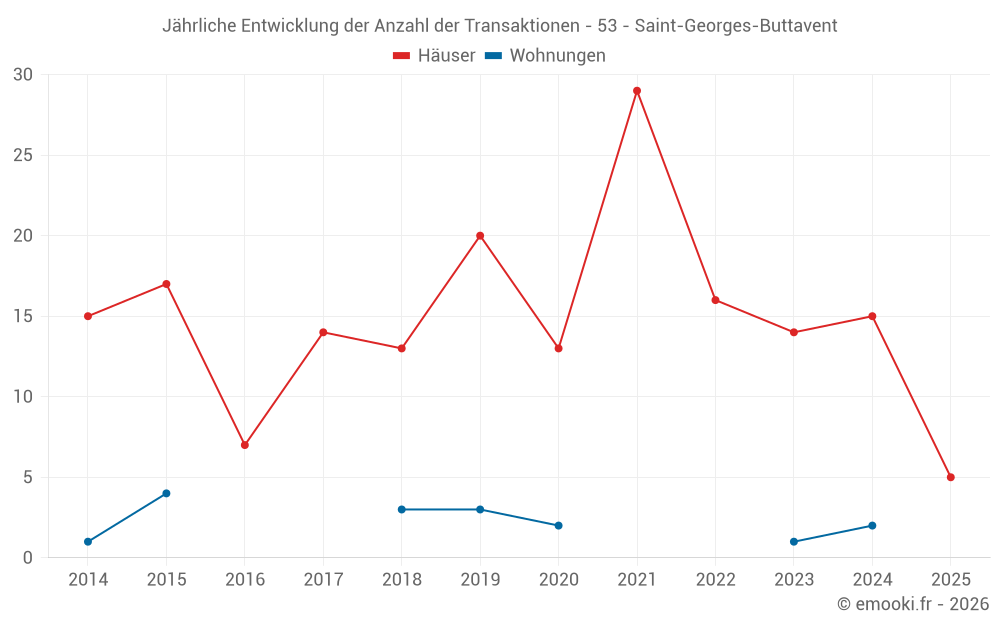 Der Durchschnittspreis auf den 16 Hausgeschäften der letzten 12 Monate in der Gemeinde Saint-Georges-Buttavent betrug 982 € pro Quadratmeter für einen mittleren Immobilienwert von 100 675 €. Über diesen Zeitraum hinweg lagen 60% der Transaktionen zwischen 405 und 1 490 € pro Quadratmeter (vom 2. bis zum 8. Dezil).