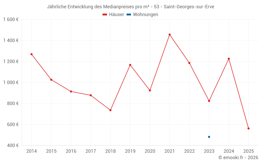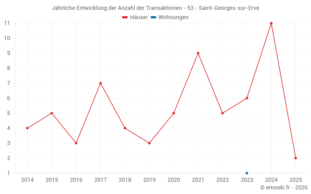 Der Durchschnittspreis auf den 17 Hausgeschäften der letzten 24 Monate in der Gemeinde Saint-Georges-sur-Erve betrug 952 € pro Quadratmeter für einen mittleren Immobilienwert von 62 000 €. Über diesen Zeitraum hinweg lagen 60% der Transaktionen zwischen 664 und 1 367 € pro Quadratmeter (vom 2. bis zum 8. Dezil).