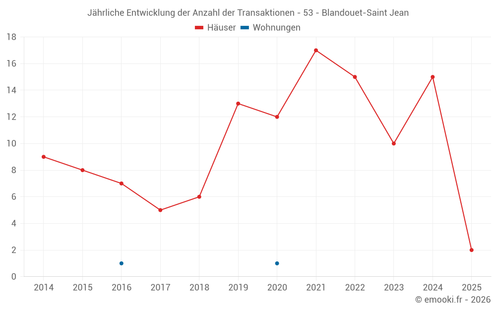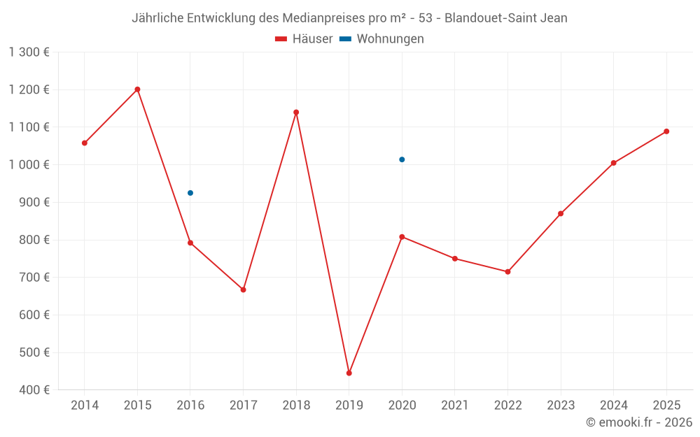 Der Durchschnittspreis auf den 25 Hausgeschäften der letzten 24 Monate in der Gemeinde Blandouet-Saint Jean betrug 838 € pro Quadratmeter für einen mittleren Immobilienwert von 80 000 €. Über diesen Zeitraum hinweg lagen 60% der Transaktionen zwischen 560 und 1 615 € pro Quadratmeter (vom 2. bis zum 8. Dezil).