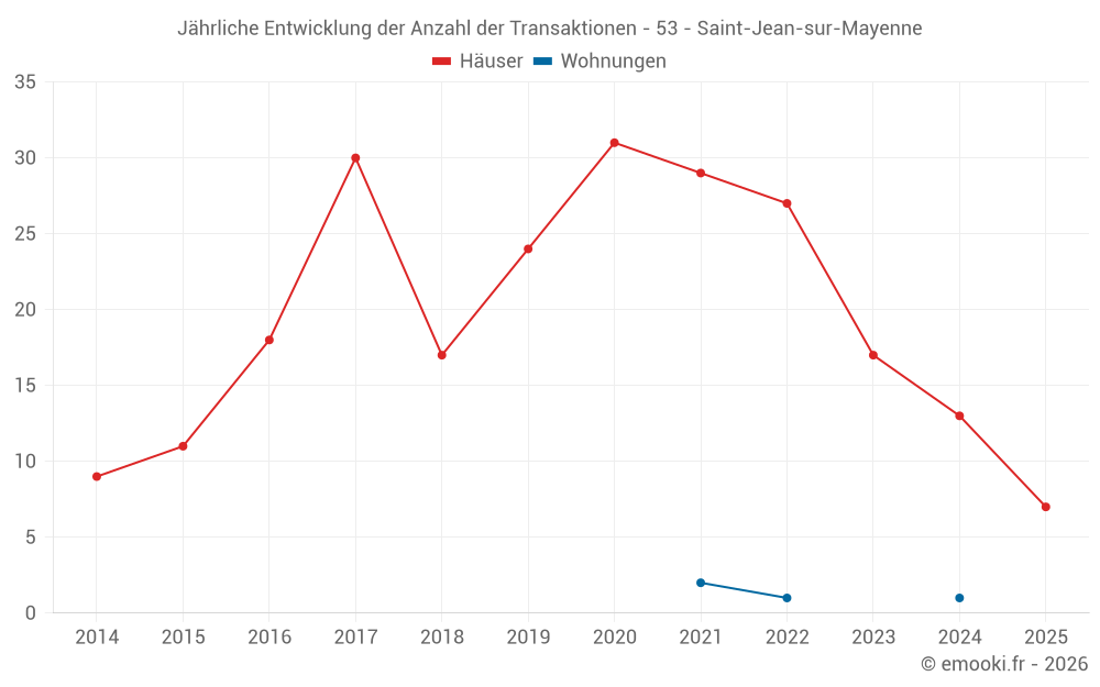 Der Durchschnittspreis auf den 17 Hausgeschäften der letzten 12 Monate in der Gemeinde Saint-Jean-sur-Mayenne betrug 1 910 € pro Quadratmeter für einen mittleren Immobilienwert von 185 000 €. Über diesen Zeitraum hinweg lagen 60% der Transaktionen zwischen 1 586 und 2 485 € pro Quadratmeter (vom 2. bis zum 8. Dezil).