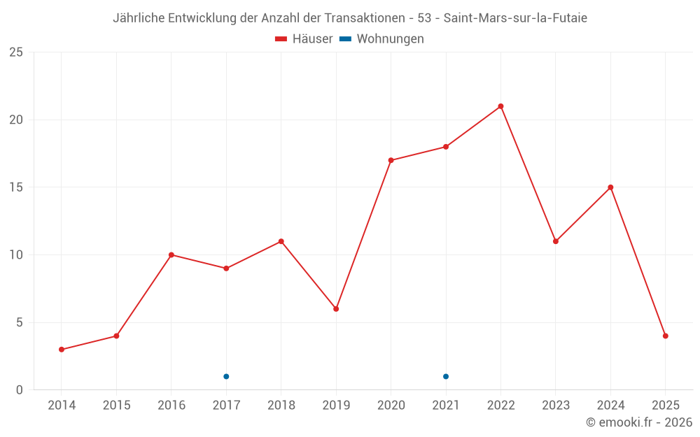 Der Durchschnittspreis auf den 27 Hausgeschäften der letzten 24 Monate in der Gemeinde Saint-Mars-sur-la-Futaie betrug 1 243 € pro Quadratmeter für einen mittleren Immobilienwert von 92 100 €. Über diesen Zeitraum hinweg lagen 60% der Transaktionen zwischen 750 und 1 588 € pro Quadratmeter (vom 2. bis zum 8. Dezil).