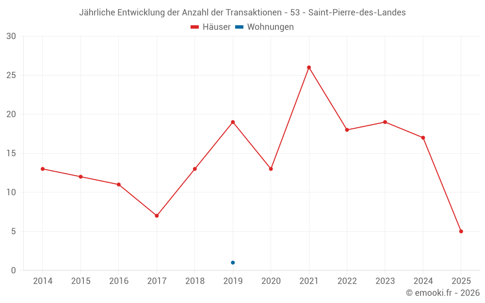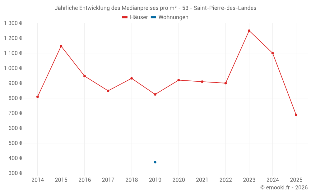 Der Durchschnittspreis auf den 30 Hausgeschäften der letzten 24 Monate in der Gemeinde Saint-Pierre-des-Landes betrug 1 037 € pro Quadratmeter für einen mittleren Immobilienwert von 85 000 €. Über diesen Zeitraum hinweg lagen 60% der Transaktionen zwischen 535 und 1 662 € pro Quadratmeter (vom 2. bis zum 8. Dezil).