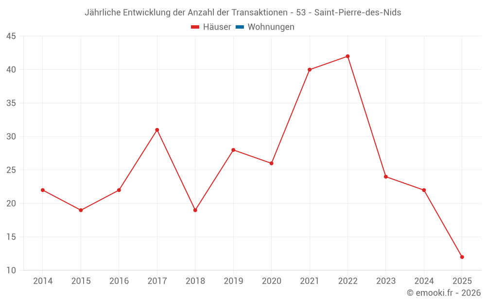 Der Durchschnittspreis auf den 26 Hausgeschäften der letzten 12 Monate in der Gemeinde Saint-Pierre-des-Nids betrug 1 088 € pro Quadratmeter für einen mittleren Immobilienwert von 124 000 €. Über diesen Zeitraum hinweg lagen 60% der Transaktionen zwischen 784 und 1 739 € pro Quadratmeter (vom 2. bis zum 8. Dezil).