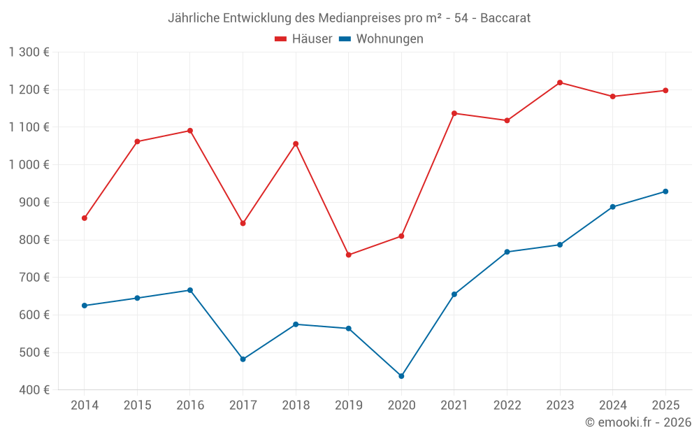 Der Durchschnittspreis auf den 32 Hausgeschäften der letzten 12 Monate in der Gemeinde Baccarat betrug 1 198 € pro Quadratmeter für einen mittleren Immobilienwert von 96 000 €. Über diesen Zeitraum hinweg lagen 60% der Transaktionen zwischen 688 und 1 705 € pro Quadratmeter (vom 2. bis zum 8. Dezil).