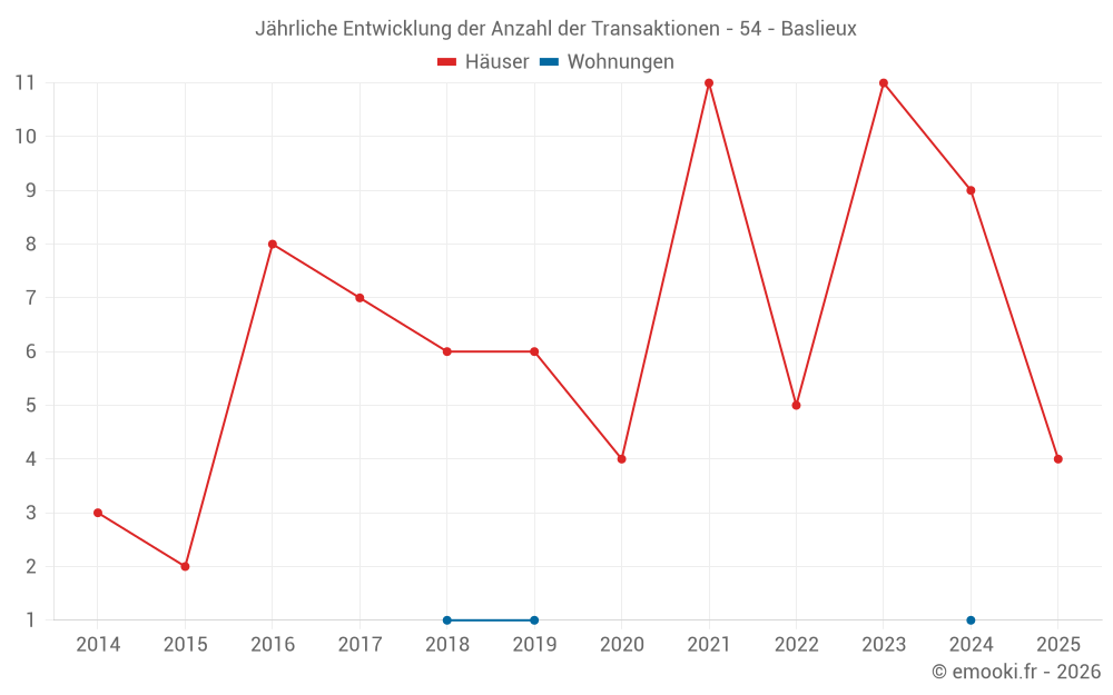 Der Durchschnittspreis auf den 17 Hausgeschäften der letzten 24 Monate in der Gemeinde Baslieux betrug 2 100 € pro Quadratmeter für einen mittleren Immobilienwert von 194 000 €. Über diesen Zeitraum hinweg lagen 60% der Transaktionen zwischen 1 622 und 2 508 € pro Quadratmeter (vom 2. bis zum 8. Dezil).