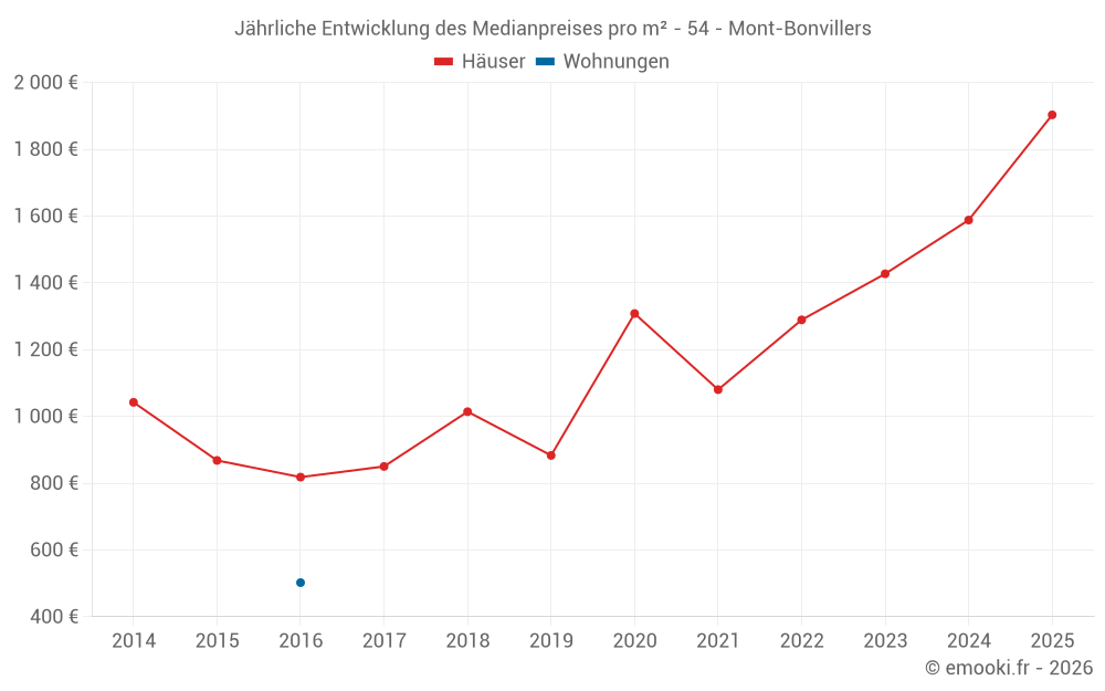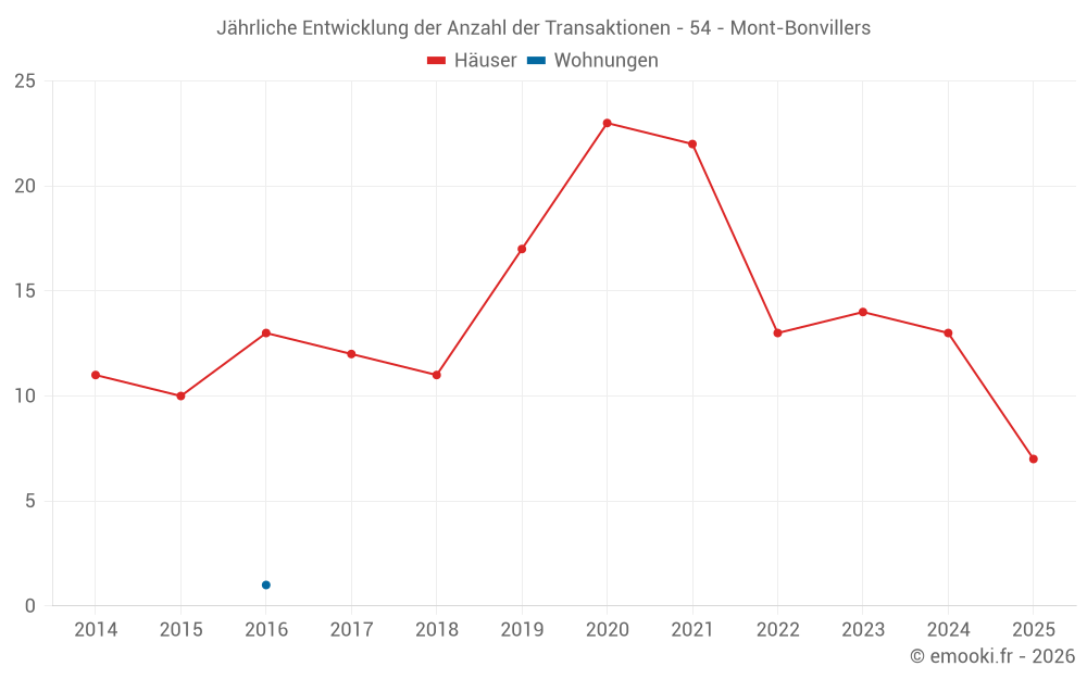 Der Durchschnittspreis auf den 30 Hausgeschäften der letzten 24 Monate in der Gemeinde Mont-Bonvillers betrug 1 433 € pro Quadratmeter für einen mittleren Immobilienwert von 128 225 €. Über diesen Zeitraum hinweg lagen 60% der Transaktionen zwischen 969 und 2 069 € pro Quadratmeter (vom 2. bis zum 8. Dezil).