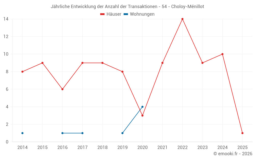 Der Durchschnittspreis auf den 16 Hausgeschäften der letzten 24 Monate in der Gemeinde Choloy-Ménillot betrug 1 512 € pro Quadratmeter für einen mittleren Immobilienwert von 136 500 €. Über diesen Zeitraum hinweg lagen 60% der Transaktionen zwischen 1 143 und 2 264 € pro Quadratmeter (vom 2. bis zum 8. Dezil).