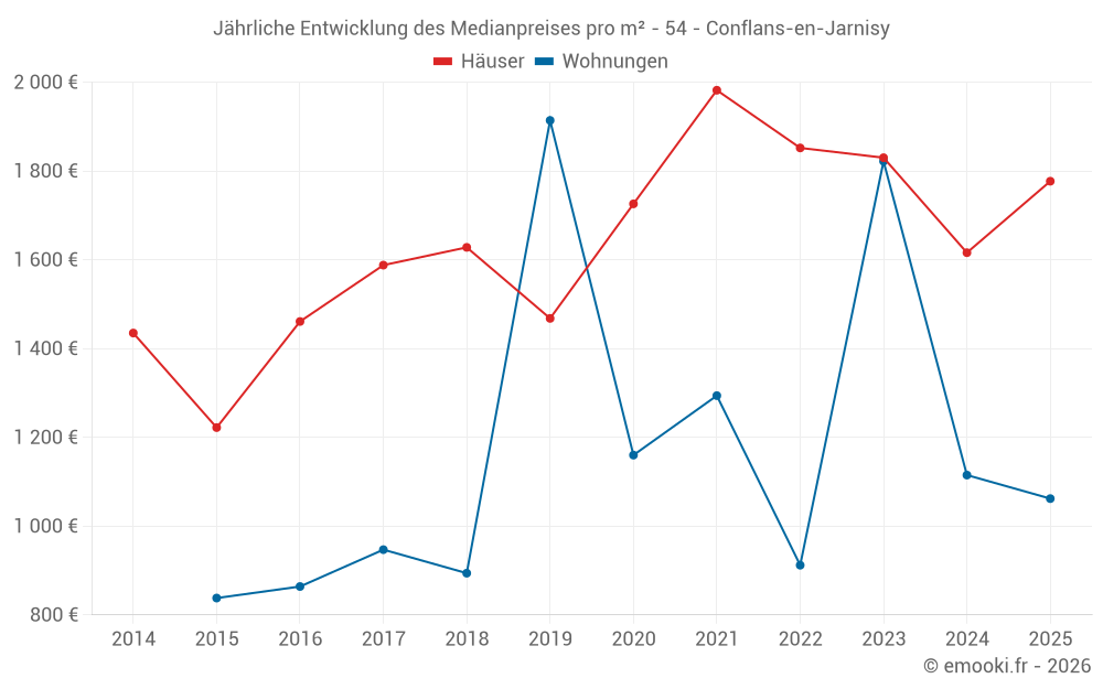 Der Durchschnittspreis auf den 22 Hausgeschäften der letzten 12 Monate in der Gemeinde Conflans-en-Jarnisy betrug 1 703 € pro Quadratmeter für einen mittleren Immobilienwert von 151 225 €. Über diesen Zeitraum hinweg lagen 60% der Transaktionen zwischen 1 117 und 2 127 € pro Quadratmeter (vom 2. bis zum 8. Dezil).
