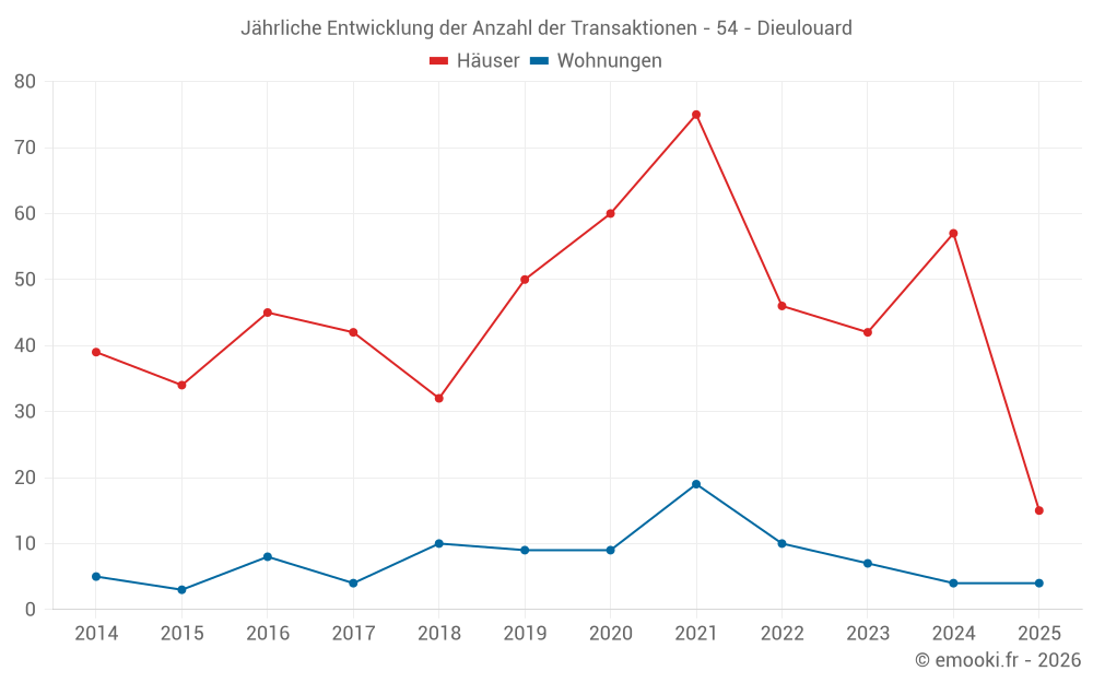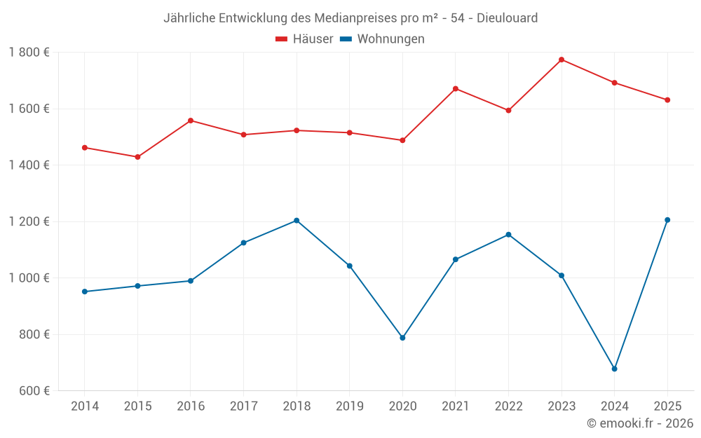 Der Durchschnittspreis auf den 43 Hausgeschäften der letzten 12 Monate in der Gemeinde Dieulouard betrug 1 631 € pro Quadratmeter für einen mittleren Immobilienwert von 144 000 €. Über diesen Zeitraum hinweg lagen 60% der Transaktionen zwischen 1 047 und 2 016 € pro Quadratmeter (vom 2. bis zum 8. Dezil).