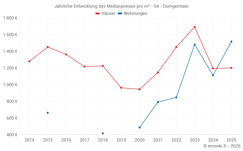 Der Durchschnittspreis auf den 22 Hausgeschäften der letzten 24 Monate in der Gemeinde Domgermain betrug 1 294 € pro Quadratmeter für einen mittleren Immobilienwert von 148 322 €. Über diesen Zeitraum hinweg lagen 60% der Transaktionen zwischen 723 und 2 012 € pro Quadratmeter (vom 2. bis zum 8. Dezil).