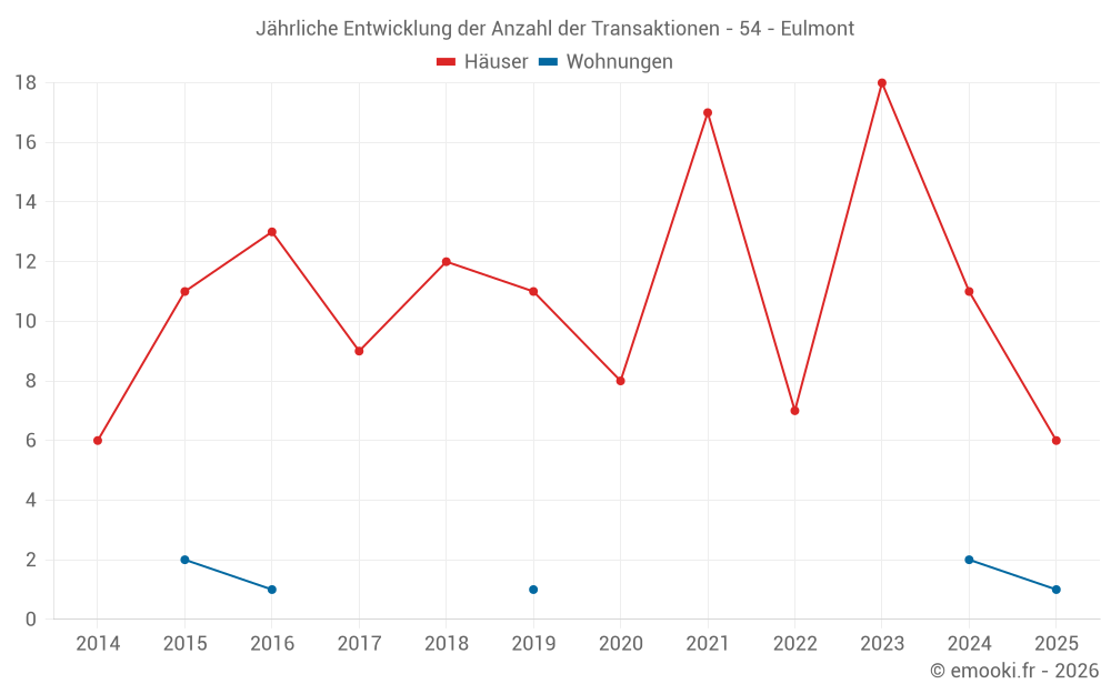 Der Durchschnittspreis auf den 25 Hausgeschäften der letzten 24 Monate in der Gemeinde Eulmont betrug 2 011 € pro Quadratmeter für einen mittleren Immobilienwert von 316 100 €. Über diesen Zeitraum hinweg lagen 60% der Transaktionen zwischen 1 378 und 2 579 € pro Quadratmeter (vom 2. bis zum 8. Dezil).