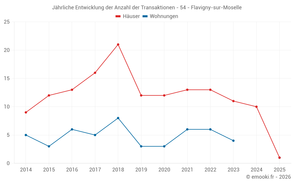 Der Durchschnittspreis auf den 14 Hausgeschäften der letzten 24 Monate in der Gemeinde Flavigny-sur-Moselle betrug 1 741 € pro Quadratmeter für einen mittleren Immobilienwert von 190 250 €. Über diesen Zeitraum hinweg lagen 60% der Transaktionen zwischen 1 109 und 2 798 € pro Quadratmeter (vom 2. bis zum 8. Dezil).