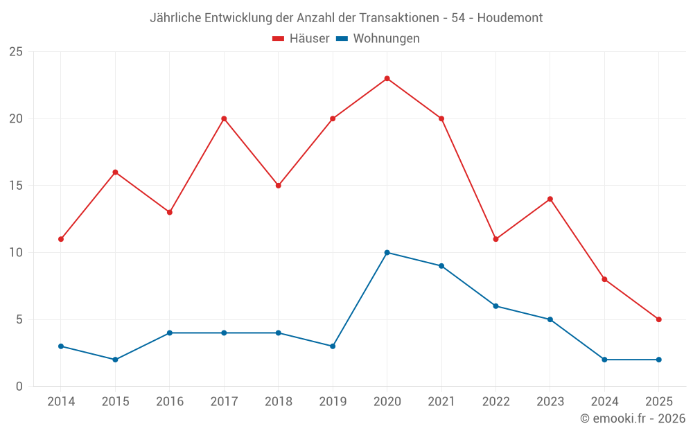 Der Durchschnittspreis auf den 22 Hausgeschäften der letzten 24 Monate in der Gemeinde Houdemont betrug 2 627 € pro Quadratmeter für einen mittleren Immobilienwert von 269 500 €. Über diesen Zeitraum hinweg lagen 60% der Transaktionen zwischen 2 087 und 2 951 € pro Quadratmeter (vom 2. bis zum 8. Dezil).